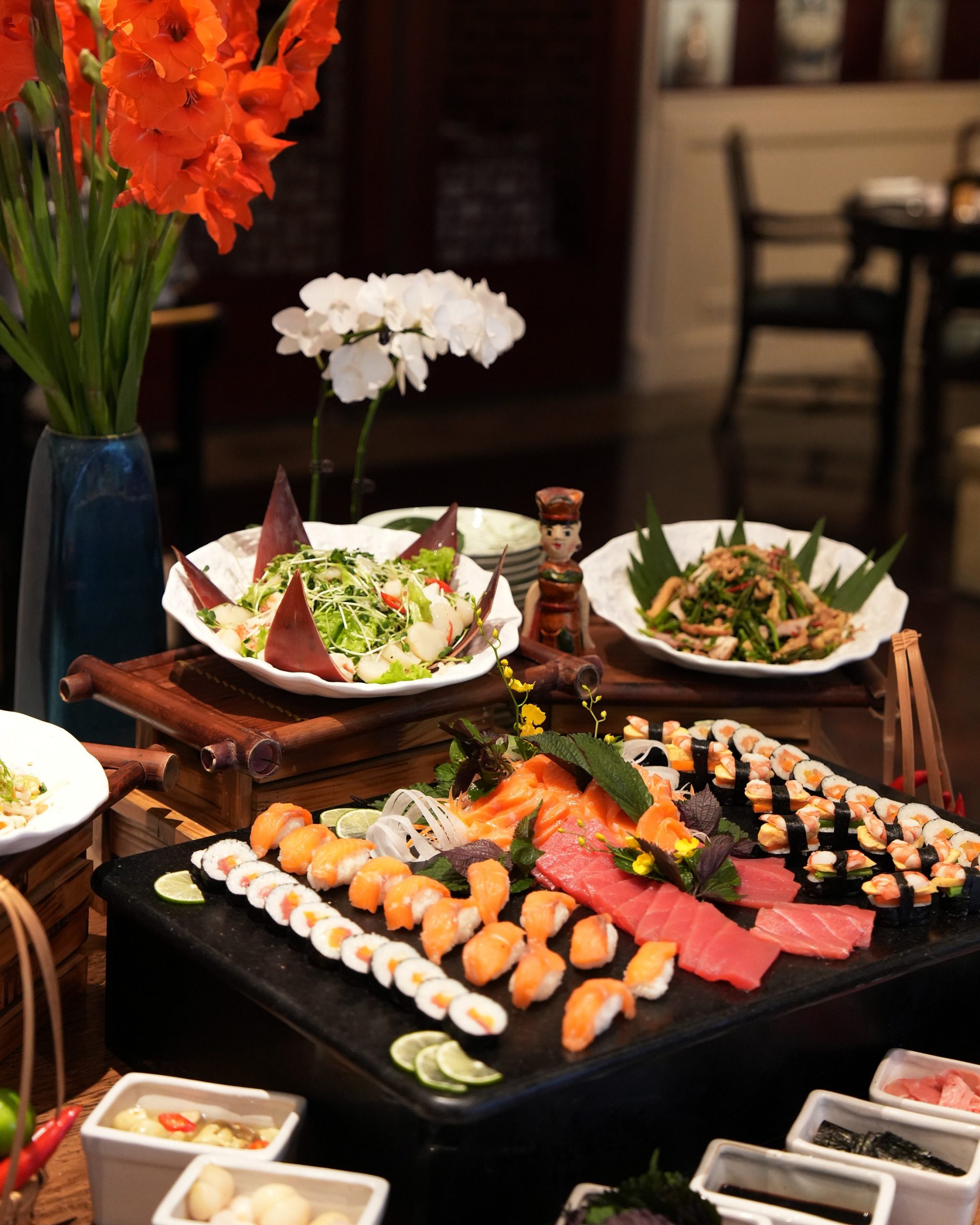 Thỏa mãn vị giác với quầy buffet gồm các món khai vị nóng và lạnh đặc sắc – từ các loại salad, nộm và các món cuốn tươi ngon đến sushi và sashimi thượng hạng – kèm theo các món tráng miệng truyền thống phong phú cùng các loại đồ uống không cồn thanh mát.